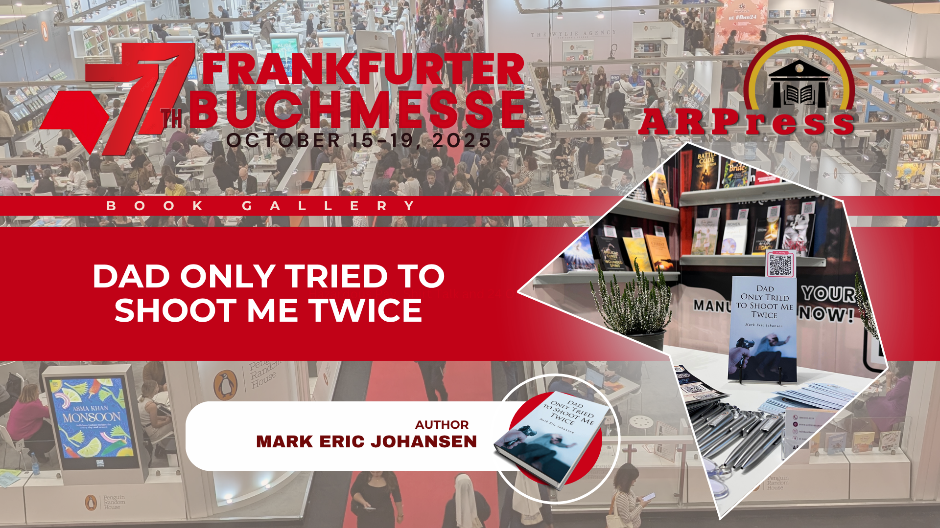 Among the books displayed by ARPress at the Frankfurter Buchmesse in Frankfurt, Germany, from October 15 to 19, 2025, Dad Only Tried to Shoot Me Twice by Mark Eric Johansen stood out quietly amid the buzz of the world’s largest publishing event. The fair, in its 77th edition, felt like a live pulse of the book-world: five days where ideas, culture, commerce, discovery and connection all collided in one place.