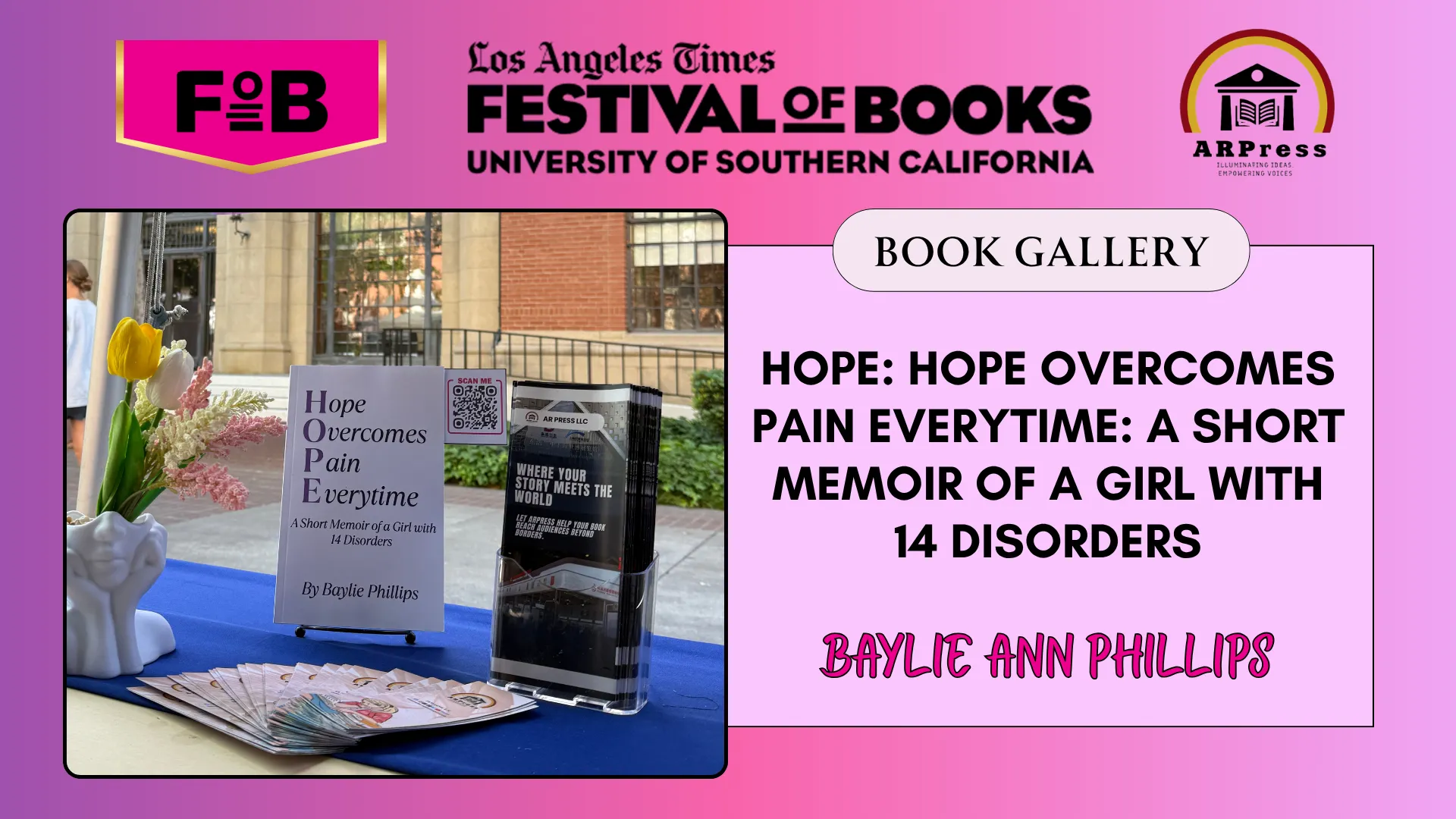 The festival, organized annually by the Los Angeles Times, serves as a major hub for the publishing industry, where authors and publishers gain visibility, connect with readers, and engage in conversations that shape contemporary literary culture. With hundreds of exhibitors and a wide range of programming, LATFOB creates direct pathways for authors to present new works, reach wider audiences, and participate in discussions that extend beyond the page. For ARPress, this environment supports its mission of amplifying author voices and positioning its catalog within a global literary marketplace.