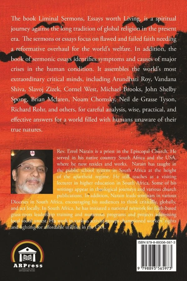 The book Liminal Sermons, Essays worth Living, is a spiritual journey against the long tradition of global religion in the present era. The sermons or essays focus on flawed and failed faith needing a reformative overhaul for the world’s welfare. In addition, the book of sermonic essays identifies symptoms and causes of major crises in the human condition. It assembles the world’s most extraordinary critical minds, including Arundhati Roy, Vandana Shiva, Slavoj Zizek, Cornel West, Michael Brooks, John Shelby Spong, Brian Mclaren, Noam Chomsky, Neil de Grasse Tyson, Richard Rohr, and others, for careful analysis, wise, practical, and effective answers for a world filled with humans unaware of their true natures. Errol Narrain