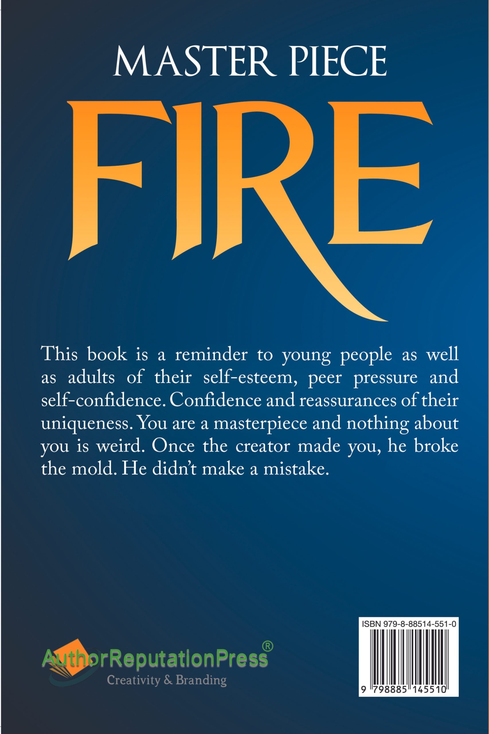 This book is a reminder to young people as well as adults of their self esteem, peer pressure and self confidence. Confidence and reassurances of their uniqueness. You are a masterpiece and nothing about you is weird. Once the creator made you he broke the mold. He didn’t make a mistake.