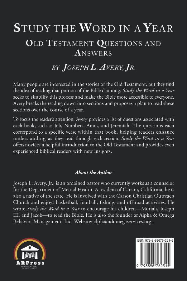 Joseph L. Avery, Jr., is an ordained pastor who currently works as a counselor for the Department of Mental Health. A resident of Carson, California, he is also a native of the state. He is involved with the Carson Christian Outreach Church and enjoys basketball, football, fishing, and off-road activities. He wrote Study the Word in a Year to encourage his children-Moriah, Joseph III, and Jacob-to read the Bible. He is also the founder of Alpha & Omega Behavior Management, Inc. Website: alphaandomegaservices.org.