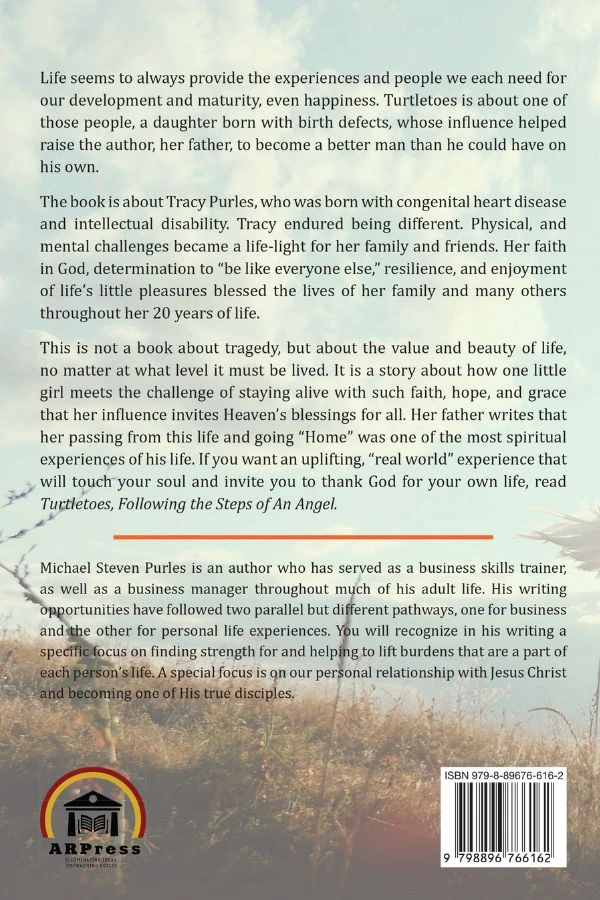 This is not a book about tragedy, but about the value and beauty of life, no matter at what level it must be lived. It is a story about how one little girl meets the challenge of staying alive with such faith, hope, and grace that her influence invites Heaven’s blessings for all. Her father writes that her passing from this life and going “Home” was one of the most spiritual experiences of his life. If you want an uplifting, “real world” experience that will touch your soul and invite you to thank God for your own life, read Turtletoes, Following the Steps of An Angel. Michael Steven Purles